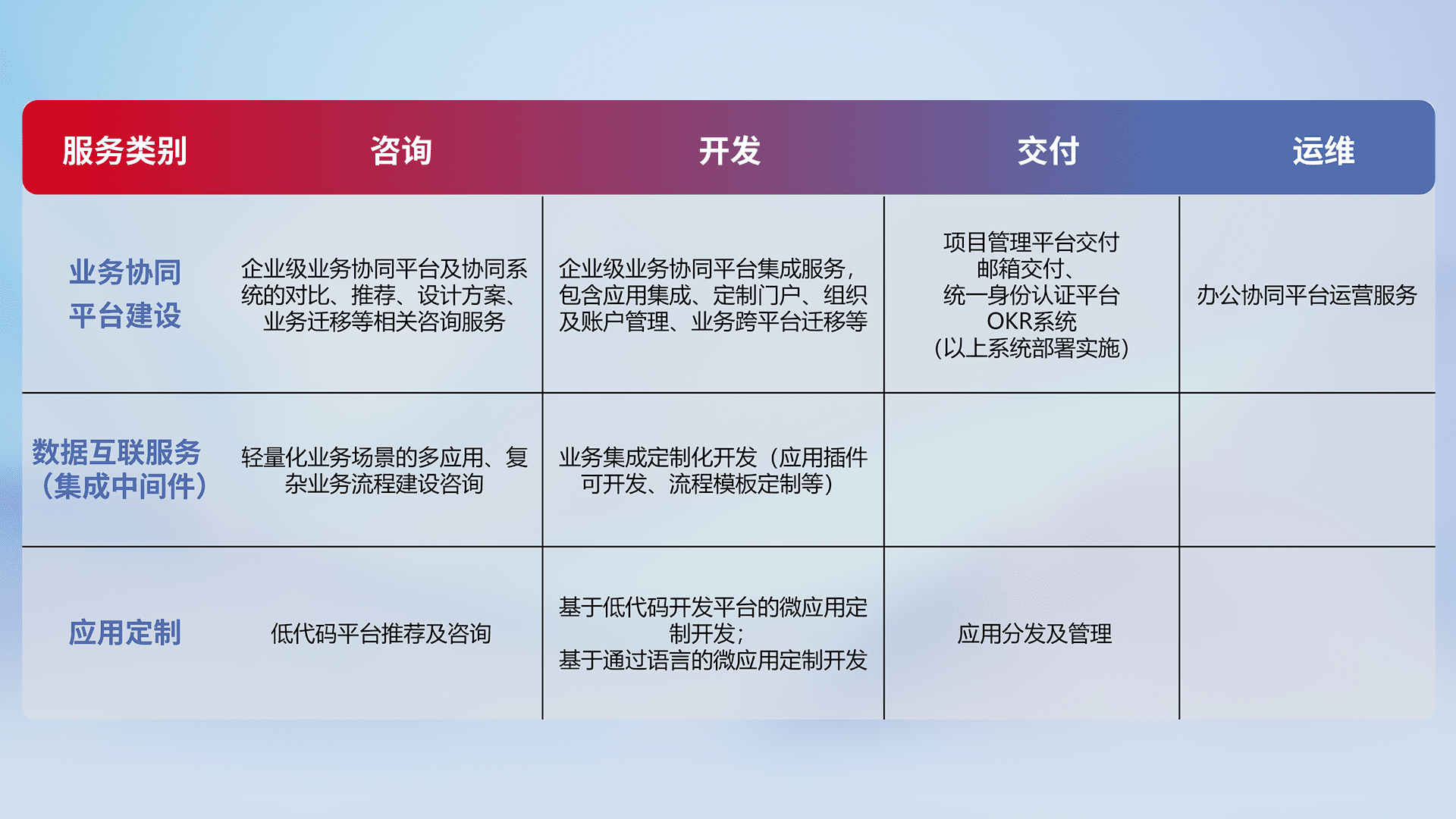 针对钉钉、、、、企微、、、IDaas等平台级产品提供产品的规划、、、方案、、交付、、、、定制化开发等服务,,实现如统一协同办公、、、、智能客户服务、、、、混合会议管理、、、智能数据查询、、、等业务场景,,,,实现数字化转型。。。